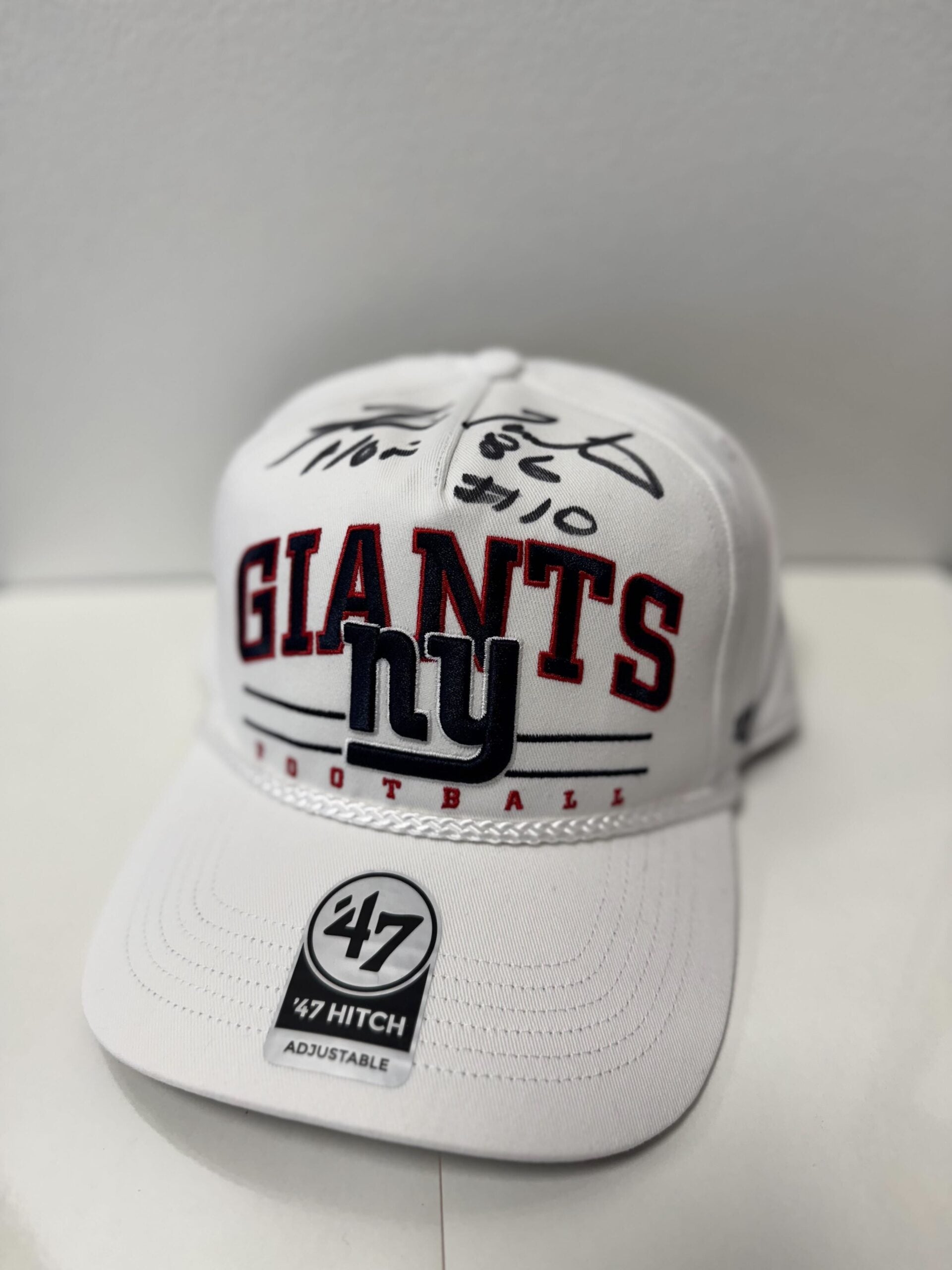 Show your Giants pride with this white ’47 Roscoe Hitch adjustable hat, featuring vintage rope-cord styling and bold team embroidery. Hand-signed by Hall of Famer Fran Tarkenton, it’s the perfect blend of game-day style and collectible NFL history.